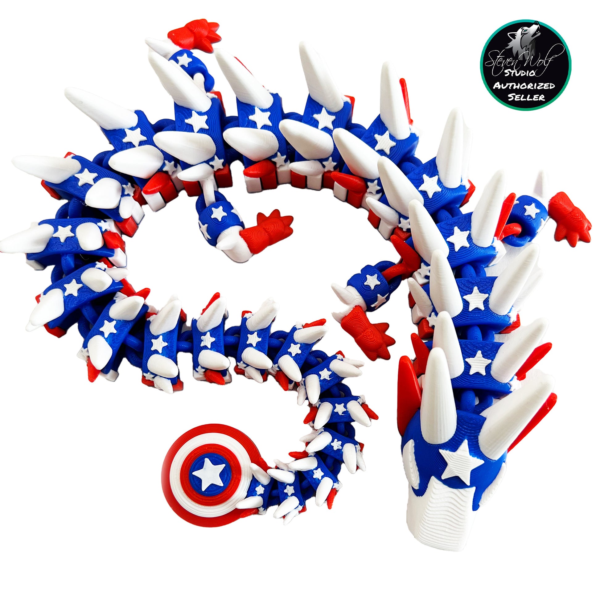 Show off your patriotic pride with this America-inspired articulated dragon! Designed by Steven Wolf Studio and printed by an authorized seller, this stunning flexi dragon features a bold red, white, and blue color scheme, complete with stars, stripes, and a detailed shield at the tail.