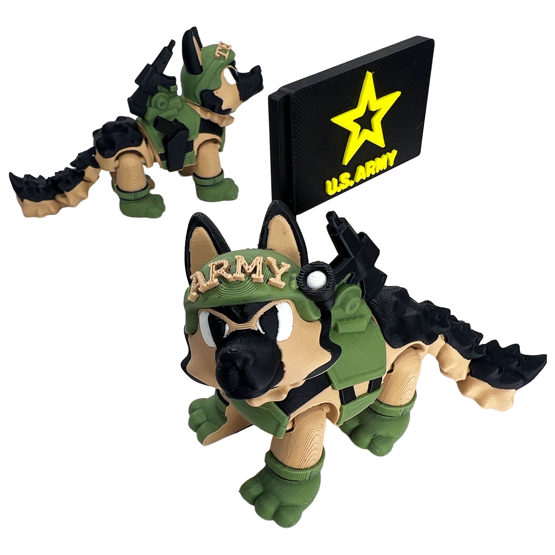 Built with movable legs and tail, the Army GSD can be posed in an alert guard position or displayed proudly on a desk, shelf, or collector stand. The layered textures and detailed equipment styling give this piece a commanding presence while maintaining lightweight durability.
