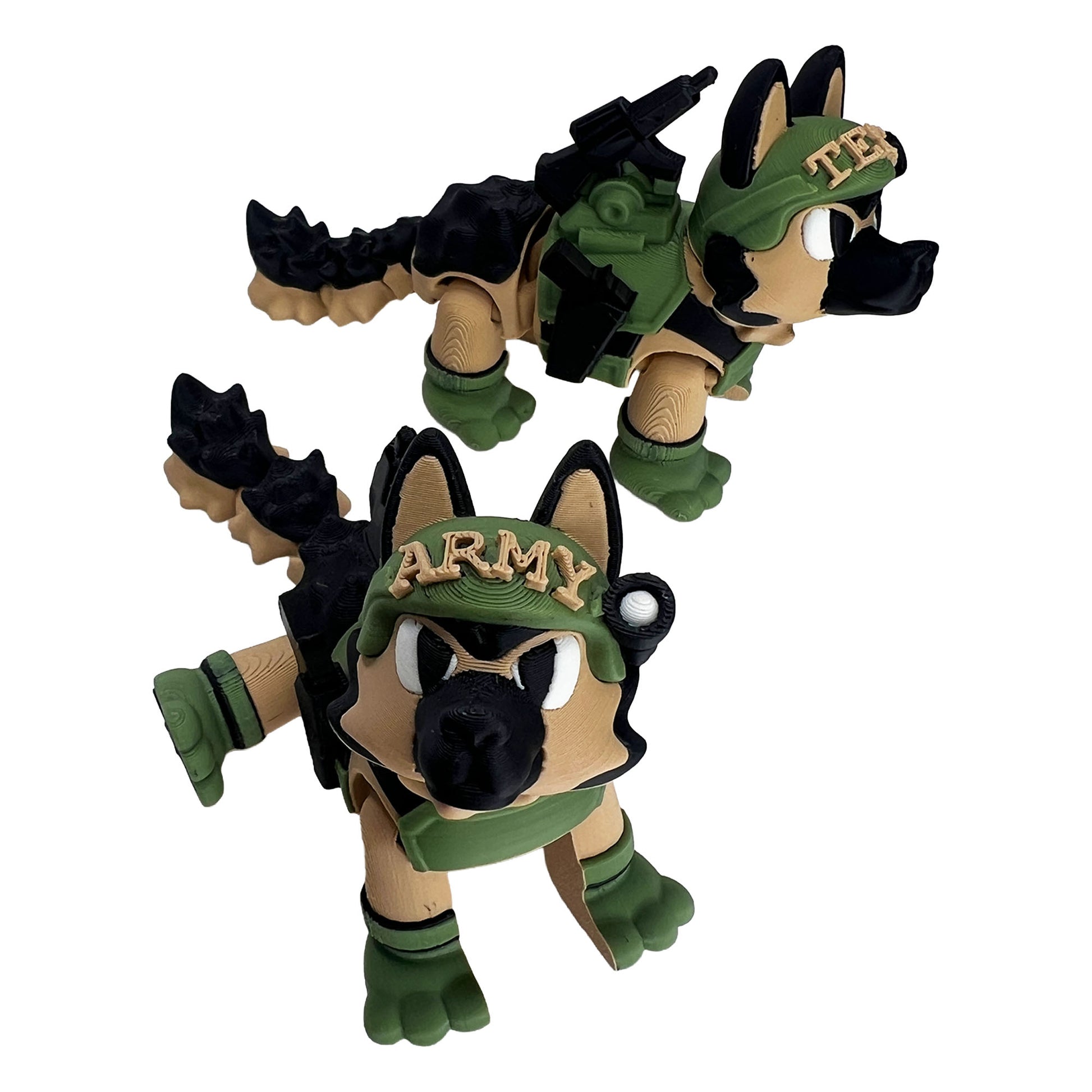 The Army GSD is a bold, fully articulated 3D-printed collectible inspired by strength, loyalty, and tactical precision. Designed with military-style gear and rugged detailing, this shepherd stands ready for display with its armored vest, helmet styling, and mission-ready stance.